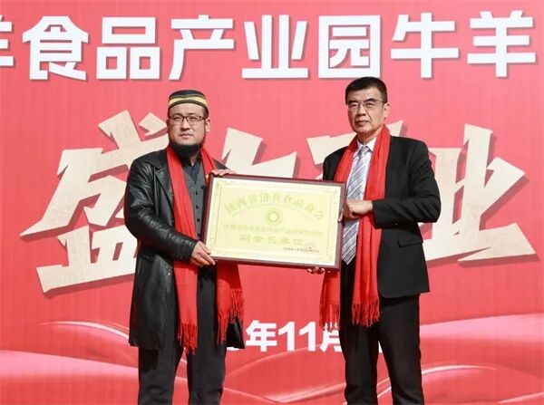 仪式现场,铁群平向陕西美羚羊食品科技有限公司颁发陕西省清真食品商会副会长单位、清真牛羊肉定点屠宰企业匾牌、授予“产业新锐奖”荣誉。
