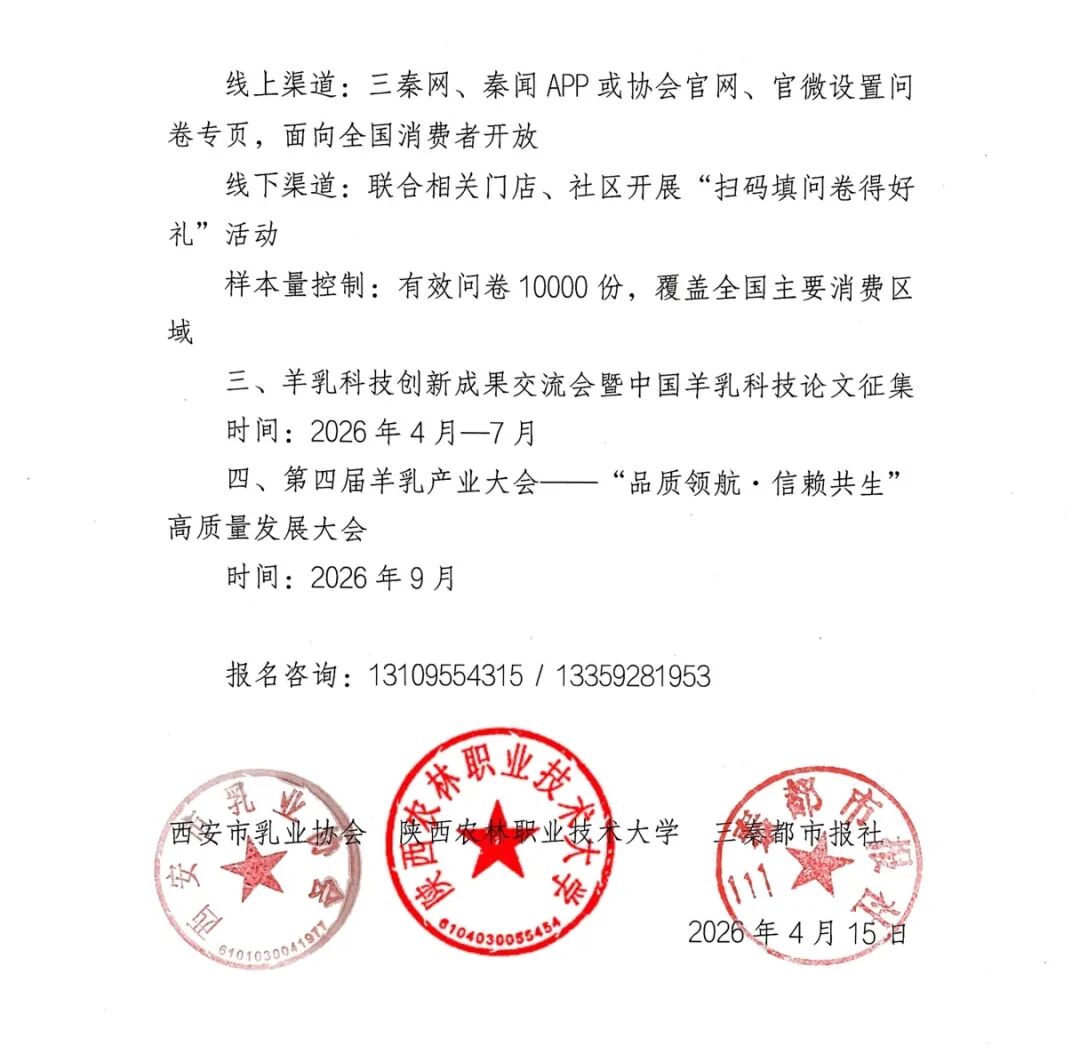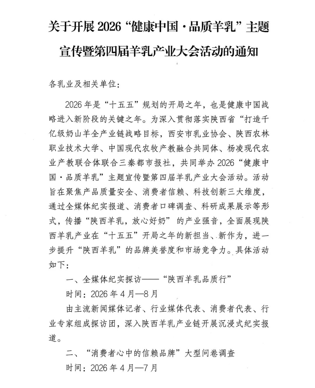 2026年是“十五五”规划的开局之年,也是健康中国战略进入新阶段的关键之年。为深入贯彻落实陕西省"打造千亿级奶山羊全产业链战略目标,西安市乳业协会、陕西农林职业技术大学、中国现代农牧产教融合共同体、杨凌现代农业产教联合体,联合三秦都市报社,共同举办2026 “健康中国 品质羊乳”主题宣传暨第四届羊乳产业大会活动。活动旨在聚焦产品质量安全,消费者信赖,科技创新三大维度,通过全媒体纪实报道,消费者口碑调查,科研成果展示等形式,传播“陕西羊乳,放心好奶”的产业强音,全面展现陕西羊乳产业在“十五五”开局之年的新担当,新作为,进一步提升“陕西羊乳”的品牌美誉度和市场竞争力。具体活动如下: